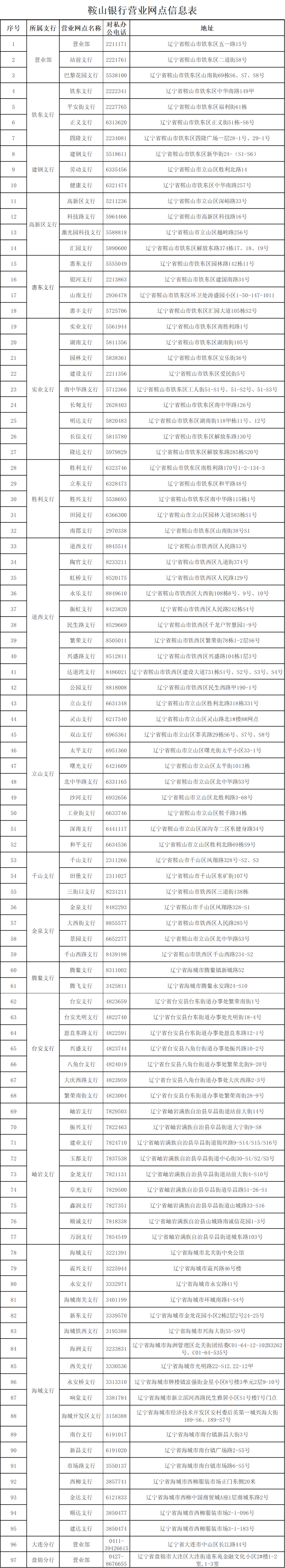 | 6 | 鞍山银行岫岩支行 | 0412-7829503 | 辽宁省鞍山市岫岩满族自治县岫岩镇站前大街(岫岩镇一街道) |