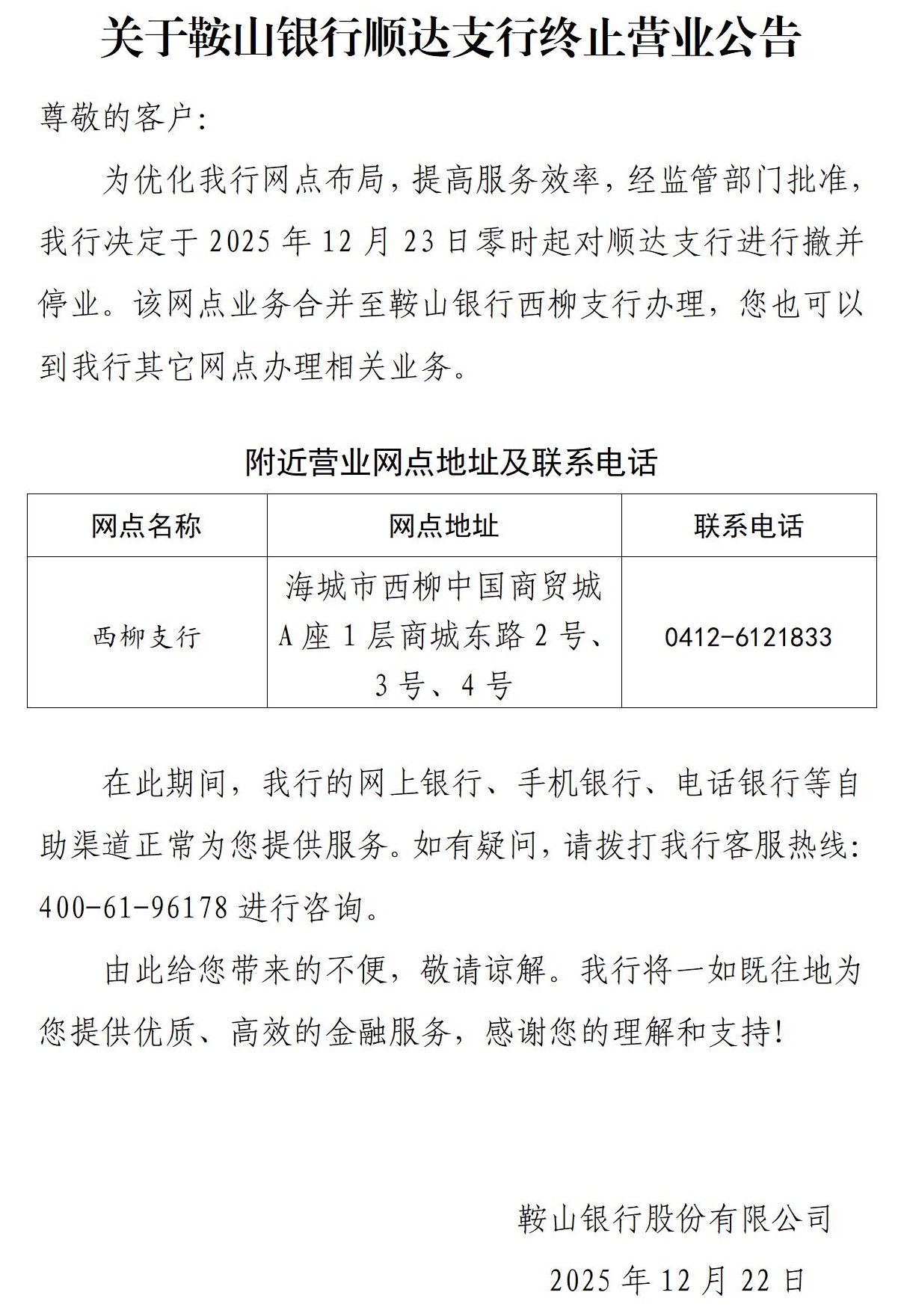 当前位置:首页 > 最新公告 >关于鞍山银行顺达支行终止营业公告